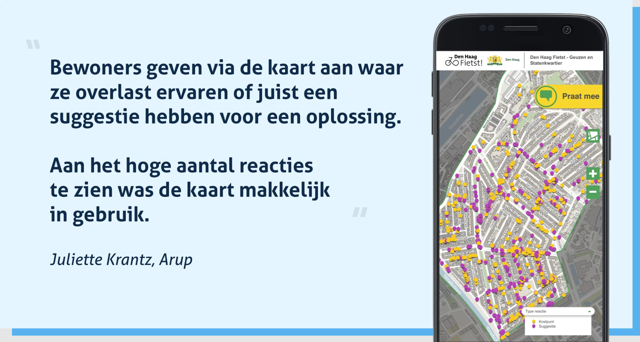 Het projectteam bij Arup, tevens bestaande uit Marco Mulder, Sanne van Zundert en Hanna Ratilainen, stuurde brieven naar bewoners met daarop een QR-code naar de PraatMee kaart. Die is via internet op zowel PC als smartphone te gebruiken, dus mensen konden meteen via hun telefoon een reactie achterlaten. Juliette: “De suggesties zijn heel specifiek. Bewoners kiezen op de kaart een specifieke locatie en laten hier een reactie achter van waar ze overlast ervaren of graag een oplossing willen. Aan het hoge aantal reacties te zien was de kaart makkelijk in gebruik.”