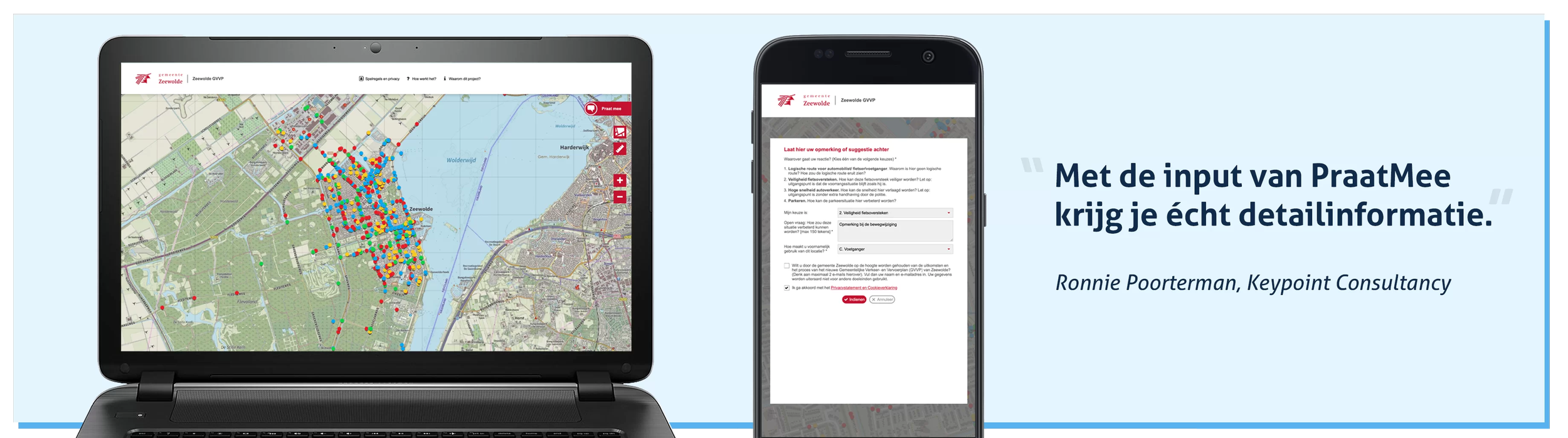 Vanaf juli 2020 is Keypoint Consultancy in opdracht van de gemeente Zeewolde bezig met het opstellen van een nieuw gemeentelijk verkeer- en vervoersplan (GVVP). Dit plan beschrijft het mobiliteitsbeleid voor de komende 10 jaar aan de hand van vier thema’s: bereikbaarheid, verkeersveiligheid, leefbaarheid en duurzaamheid. Ronnie Poorterman, Senior adviseur mobiliteit bij Keypoint en projectleider voor het GVVP Zeewolde: “Omdat de input van de mensen in Zeewolde van groot belang is, hebben wij twee participatie instrumenten ingezet: een online enquête en de PraatMee applicatie. Beiden zijn zeer goed gebruikt. Via PraatMee ontvingen wij maar liefst 1200 reacties, wat de enorme betrokkenheid van de bevolking aangeeft.”
